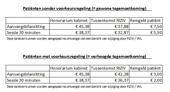 Hieronder vindt u de tarieven (honorarium) die per 1 januari 2026 van toepassing zijn indien u terugbetaling krijgt door de verplichte verzekering (RIZIV).